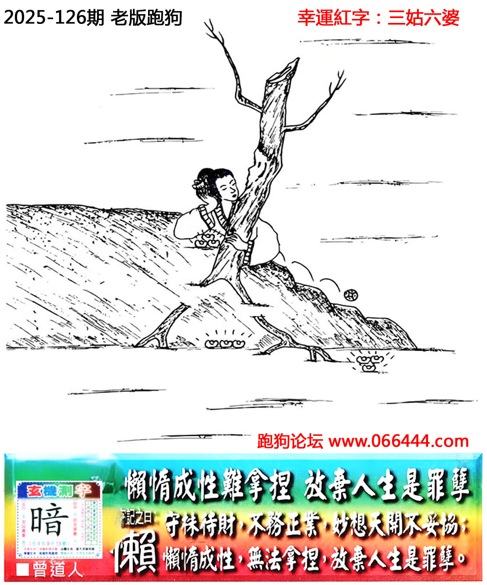 126期老版跑狗一字記之曰:【懶】 詩雲:懶惰成性難拿捏,放棄人生是罪孽。 守株待財,不務正業,妙想天開不妥協; 懶惰成性,無法拿捏,放棄人生是罪孽。 玄機測字:《暗》
