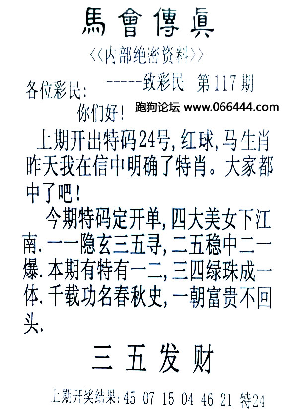 117期:{跑狗论坛}平特一尾<05-15-25-35-45>长期跟踪,稳赚不赔! |