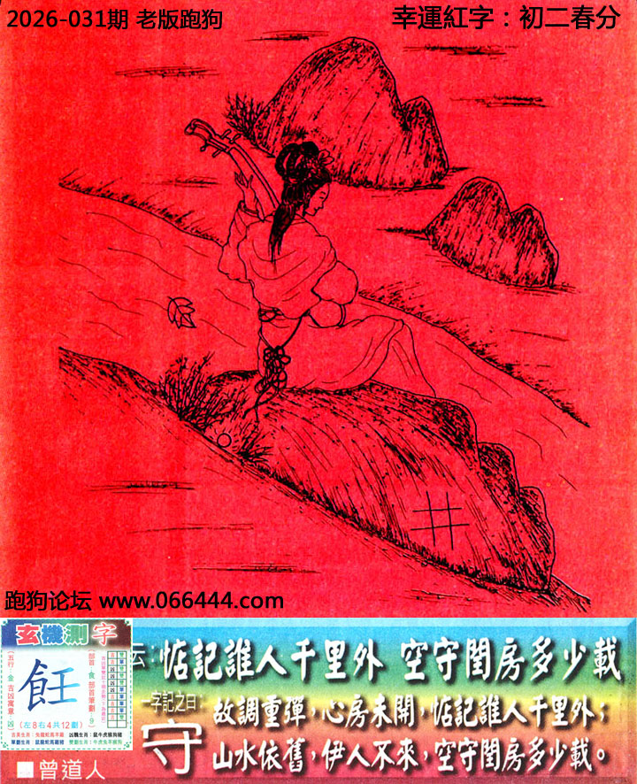 031期老版跑狗一字記之曰:【守】 詩雲:惦記誰人干里外,空守閏房多少載。 故調重彈,心房未開,惦記誰人干里外; 山水依舊,伊人不來,空守閨房多少載。 玄機測字:《飪》